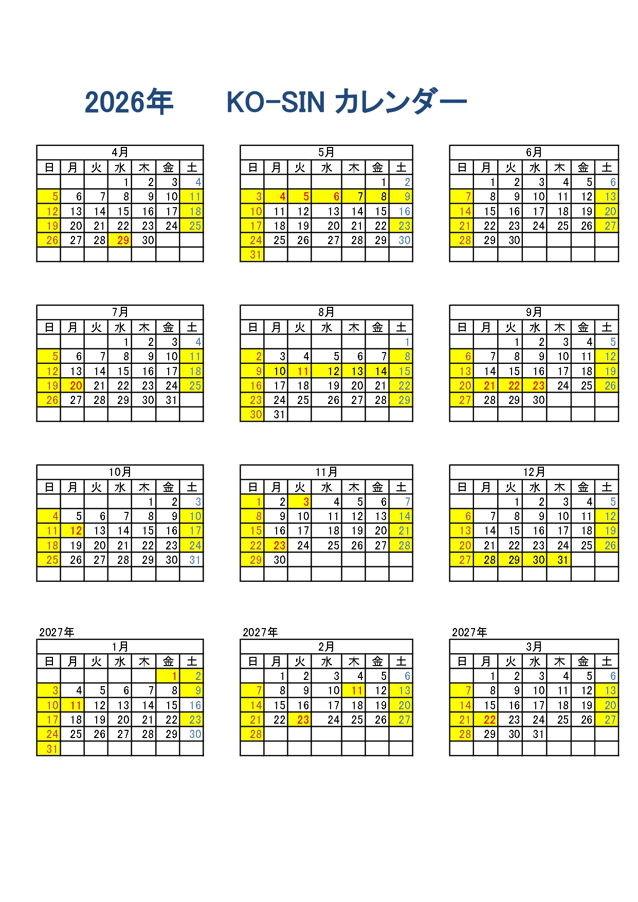 営業日カレンダー2026